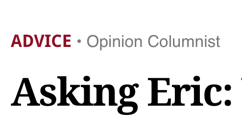 I also write the daily, nationally syndicated advice column Asking Eric and send out a weekly a humor newsletter that has been touted on NPR’s Pop Culture Happy Hour. Previously, I doled out advice as an interim Prudie for Slate.com’s popular advice column Dear Prudence and wrote a daily pop culture and politics-focused humor column for Elle.com called “Eric Reads the News”!